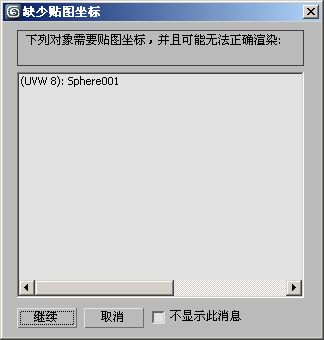 尝试使用其贴图使用非通道 1 的贴图通道的材质渲染一个或多个对象时,将显示“缺少贴图坐标”对话框。(通道 1 除外,因为在向对象指定贴图材质时,会自动启用通道 1 贴图坐标。)只有已切换为“在视口中显示贴图”的贴图才被列为缺失。