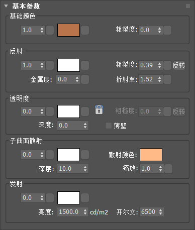 子曲面散射/半透明的颜色,通常与基础颜色相同。单击“颜色”旁边的按钮,可选择贴图、场景材质或示例。