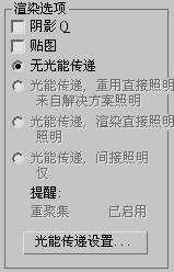- 显示表明启用还是禁用重聚集的消息。重聚集提供最精确的光能传递结果,但是同时也会极大增加光能传递的计算时间。