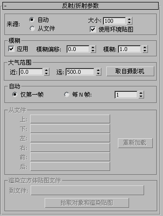 当“从文件”处于活动状态时,“渲染立方体贴图文件”组中的控件也可用。可自动生成六个立方体反射贴图并将它们保存到文件,从中可使用“从文件”中的控件加载它们。