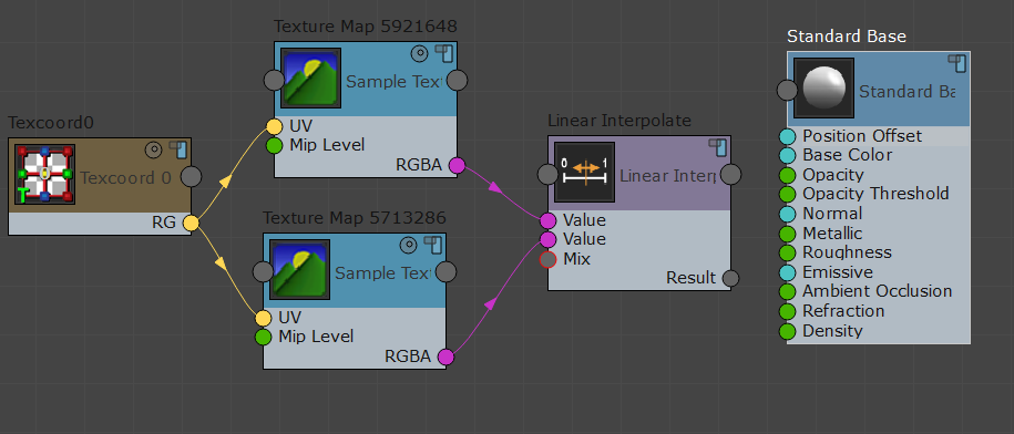 它类似于“ShaderFX 介绍性示例工作流”主题中的“使用顶点颜色节点混合纹理”示例,但此示例使用的是 Interactive“标准基础”节点及其关联的 ShaderFX 节点。
