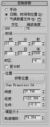 此卷展栏显示在“创建”面板上,并在选择日光或太阳光系统的灯光组件时显示在“运动”面板上。