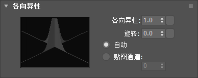 U 方向粗糙度相对于 V 方向粗糙度。单击“各向异性”旁边的按钮,可选择贴图、场景材质或示例。