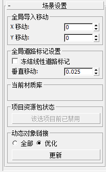 设定传入的导入数据的 X 和 Y 移动值。当源数据已在真实世界坐标系中生成时,此控件将非常有用。此类坐标系不适合在 3ds Max 中使用,并且会严重影响系统的精确性和性能。