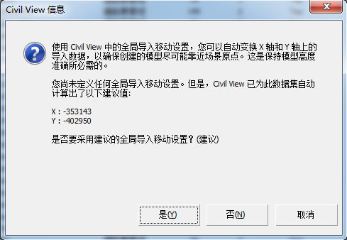 当导入具有非零原点的模型数据时,Civil View 将计算 X 和 Y 移动值,并提示您进行设定: