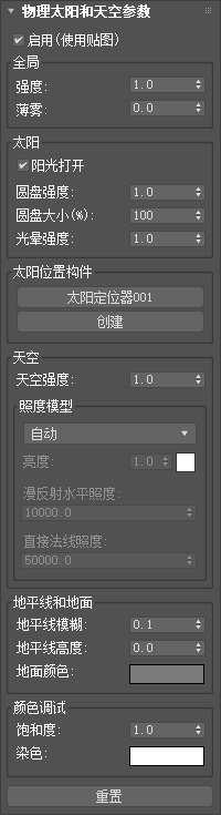 “物理太阳和天空参数”卷展栏可用于对“物理太阳和天空”环境贴图设置参数。此卷展栏等同于“Slate 材质编辑器”中针对“物理太阳和天空”环境贴图显示的卷展栏。