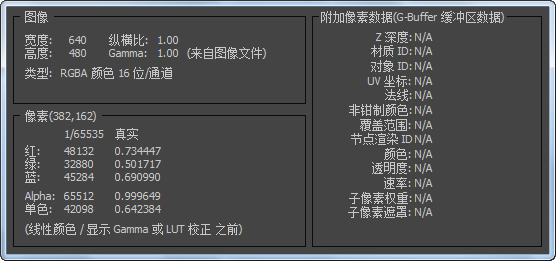 - 以 RGB 的次序显示传递给渲染器的“真实”颜色值。“渲染器”使用范围为 0.0 到 1.0 的浮点来表示每个颜色通道的范围。这样 1.0 就是 100% 或 65535(颜色值可以大于 1,但会被渲染器限制到 1)。