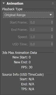 Note: 3ds Max is set to 30 frames per second (FPS) by default so animations are often converted to a new start and end time (if the source USD animation doesn't match the scene's FPS). USD Souce animation info in this dialog is expressed in USD TimeCodes per second (TPS). 3ds Max Animation Data displays the result of converting the animation to 3ds Max data, matching the frames per second set in your 3ds Max scene, and applying playback settings.
