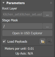 Use the Parameters Rollout in the Command Panel to configure or make changes to your loaded USD stage.