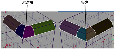 指定两个曲面的外部边(远离半径为零的边)在斜接角点的相交方式(如下图所示)。