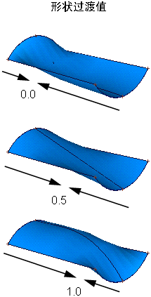 值为 0.25 时会将过渡曲线的中点置于轨道曲线距离的 25% 处,这会更多地影响第二条形状曲线。反之,值为 0.75 时将会更多地影响第一条形状曲线。