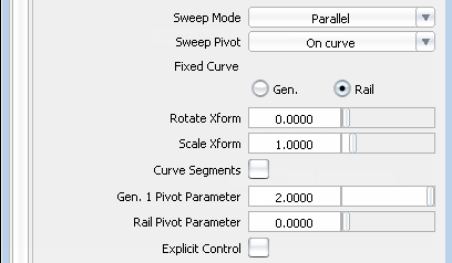 将“Rail Curves”设置为 1 类似于使用原始“Swept”工具(在 Alias 9.5 中)。将“Rail Curves”设置为 2 类似于使用原始“Birail”工具。