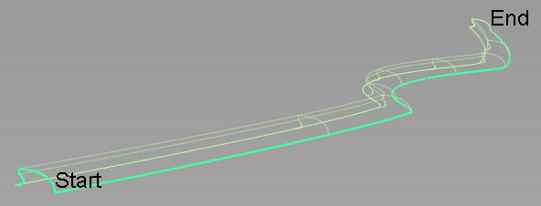 如果使用多个轮廓,则它们可以具有不同的形状,但必须具有相似的结构(锐弯之间的段或跨距数)。相对于轨道曲线,每个轮廓可以有单独的位置和方向。如果轮廓集中的曲线断开连接(非“G0”),最好为集的每个元素单独创建轮廓曲面。