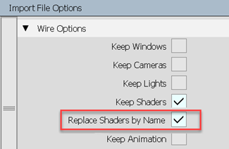 对于 .wire 文件,在“File Import Options”中添加了“Replace Shader by Name”选项。现在,当使用“Keep Shaders”将材质球与 CAD 文件一起导入时,还提供一个“Replace Shaders”选项,让您可以选择使用按名称替换。