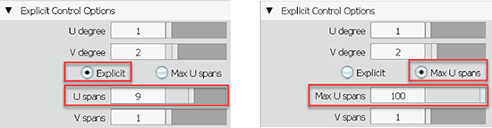使用“Explicit Controls”中新的“Explicit”选项可以指定要在输出蒙皮曲面中插入的 U 向跨距数。选择后,使用 U 向跨距控件指定要插入的精确 U 向跨距数。使用“Max U Spans”及选项和控制滑块来设置最大跨距数。