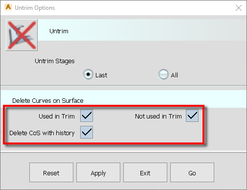 现在,您可以在使用“Untrim”工具后自动删除面上线。我们在“Untrim”工具中添加了名为“Delete Curves on Surface”的一组新选项: