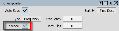 - 现在,您可以选择设置下一个自动保存检查点发生时间的提醒。在“Checkpoints”选项中,可以选择为下一个检查点之前的命令选择数(即“Frequency”)或下一个检查点之前的分钟数(即“Time”)设置提醒。在任何时候,您都可以单击提醒按钮以保存检查点,并重置计数器/计时器。您还可以单击暂停图标以暂停自动保存检查点。