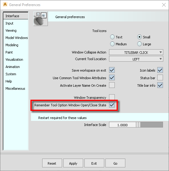 - Alias 现在允许您设置首选项,以便记住任何工具选项窗口的打开/关闭状态。这意味着,您现在可以选择在退出并重新打开工具时禁用记住工具选项窗口当前状态、相关选项和屏幕位置的选项。禁用此选项后,只有在双击工具图标时才会打开工具选项窗口。默认情况下会启用记住工具选项窗口状态的选项,并且可以在“General Preferences”>“Interface”中进行设置。
