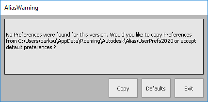 对于 Windows,用户首选项位于 C:\Users<用户名>\AppData\Roaming\Autodesk\Alias\UserPrefs2019。