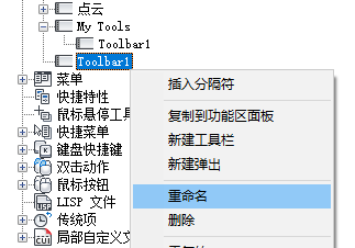 在名为“工具栏1”的工具栏上,而不是在弹出型工具栏上单击鼠标右键。单击“重命名”,然后输入新名称。