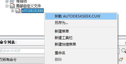 在要卸载的局部 CUIx 文件上单击鼠标右键。依次单击“卸载”