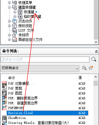 - 要创建快捷键,请在“命令列表”窗格中,将命令拖至“<文件名> 中的自定义设置”窗格的“快捷键”节点。