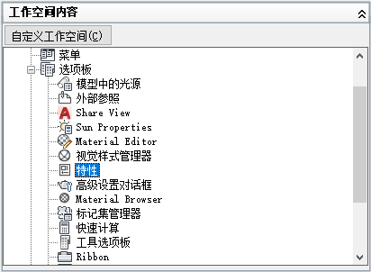 在“工作空间内容”窗格中,单击“选项板”旁边的加号 (+) 以将其展开。