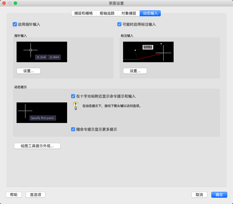控制指针输入、标注输入、动态提示以及绘图工具提示的外观。