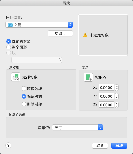 “写块”对话框将根据未选定任何内容、选定单个块还是非块对象,显示不同的默认设置。