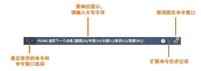 在您输入命令后,您可能会看到显示在命令行中的一系列提示。例如,输入 PLINE 并指定第一个提示后,将显示以下提示: