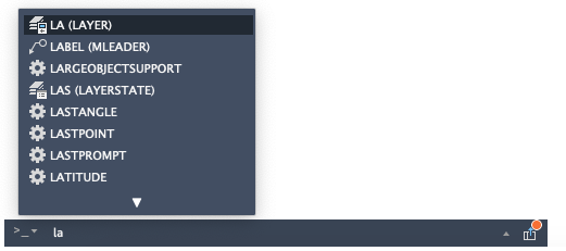 某些命令有缩写名称,或命令别名,您可以在命令行中输入它们。例如,除了通过输入 circle 来启动 CIRCLE 命令之外,还可以键入 c 并按 Enter 键。命令建议列表(如果显示)指明命令名称前面的别名: C (CIRCLE)