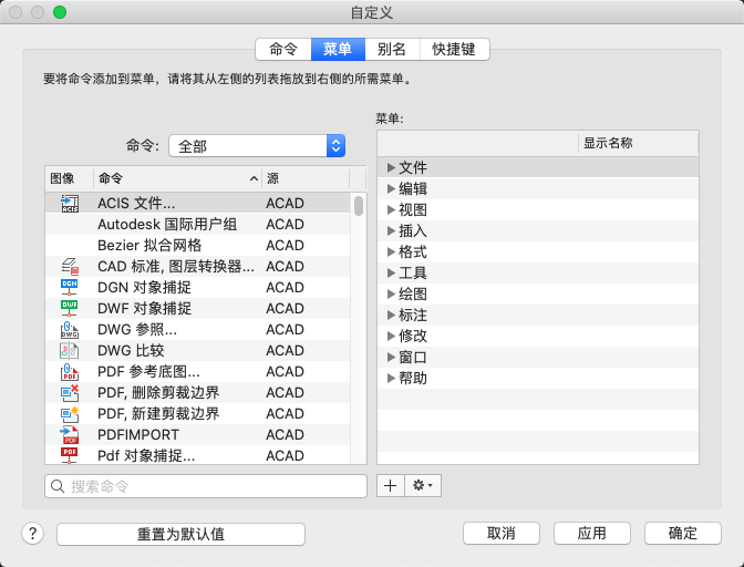 显示让您可以管理菜单中命令和子菜单的菜单。