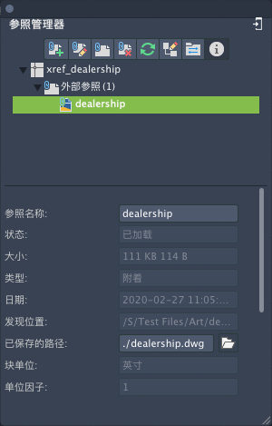 “参照管理器”选项板沿顶部包含工具栏。可以在文件列表上单击鼠标右键以显示快捷菜单,该菜单让您可以附着或管理已附着的外部参照。单击工具栏上的“显示详细信息”按钮,可查看选定外部参照的详细信息和缩略图预览。