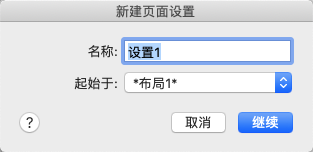指定新建页面设置要使用的基础页面设置。单击“继续”,将显示“页面设置”对话框以及所选页面设置的设置,必要时可以修改这些设置。
