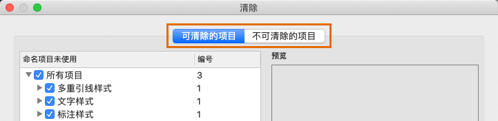 切换显示详细的对话框(包含可以清除的项目列表和预览)和具有清除所有命名项目的复选框的对话框。对话框的状态在 AutoCAD 的任务之间保持不变。