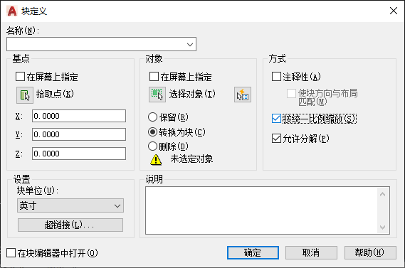 指定新块中要包含的对象,以及创建块之后如何处理这些对象,是保留还是删除选定的对象或者是将它们转换成块实例。