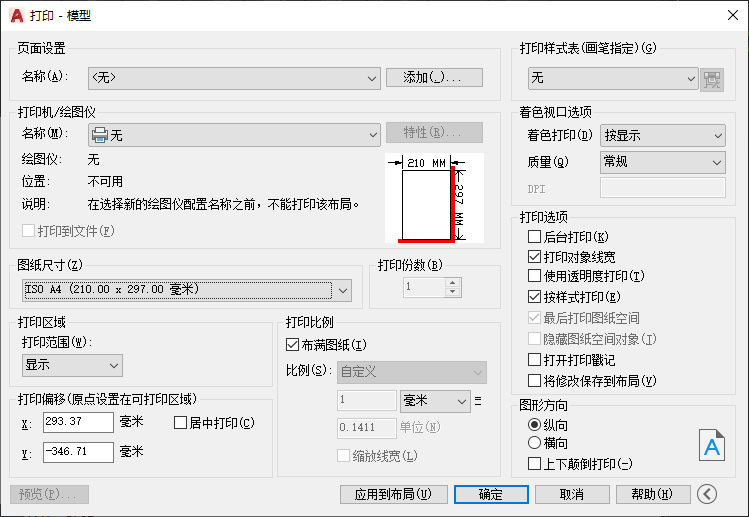 打印布局时,将打印指定图纸尺寸的可打印区域内的所有内容,其原点从布局中的 0,0 点计算得出。
