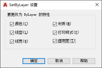 将选定对象的材质更改为“ByLayer”。(SETBYLAYERMODE=8)