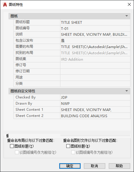 显示选定图纸的特性。还显示自定义特性(如果有)。可以输入新值以修改任何图纸特性。“需要的布局”是保存图纸的图形的路径和文件名。“找到的布局”是在其中找到图纸的图形的路径和文件名。如果需要指定其他路径,可以在“预设的布局”中修改路径和文件名。此操作将图纸和图纸集重新关联。