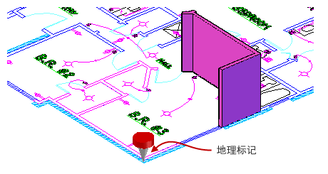 图形文件中的地理位置信息是围绕称为地理标记的图元构建的。地理标记指向模型空间中的参照点,该点对应于地球表面上具有已知的纬度和经度的位置。程序也可以在此位置捕获北向。根据该信息,程序能够导出图形文件中所有其他点的地理坐标。