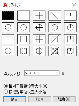设定点的显示大小。可以相对于屏幕设定点的大小,也可以用绝对单位设定点的大小。点的显示大小存储在 PDSIZE 系统变量中。以后绘制的点对象将使用新值。
