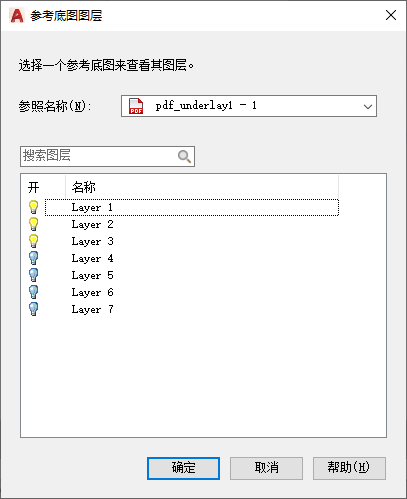 使用 DWFLAYERS、PDFLAYERS、DGNLAYERS 或 ULAYERS 命令,或在选定的参考底图上单击鼠标右键,然后单击快捷菜单中的“图层”。