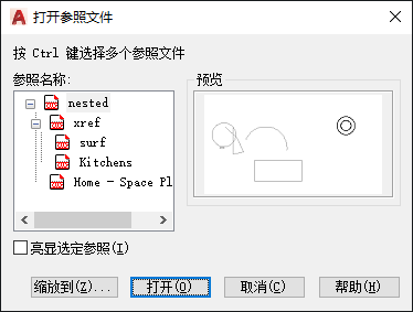 临时关闭“打开参照文件”对话框并将绘图区域中的视图缩放到选定参照。按 Enter 键重新显示该对话框。