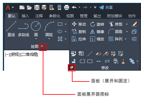 功能区由一系列选项卡组成,这些选项卡被组织到面板,其中包含很多工具栏中可用的工具和控件。