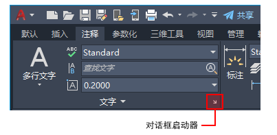 一些功能区面板提供了对与该面板相关的对话框的访问。要显示相关的对话框,请单击面板右下角处由箭头图标 表示的对话框启动器。