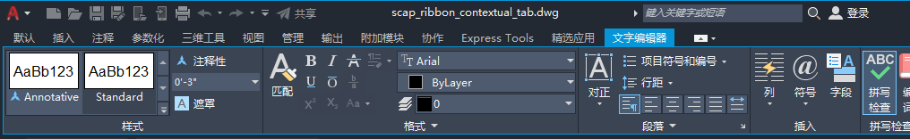 当您选择特定类型的对象或启动特定命令时,将显示上下文功能区选项卡而非工具栏或对话框。当结束命令时,上下文选项卡会关闭。