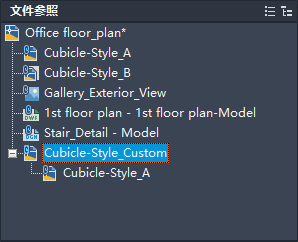 树状图的顶层始终显示当前图形。参照文件显示在下一层。可以打开包含其自身嵌套文件参照的参照文件以显示更深的层级。在树状图中进行选择时,一次只能选择一个文件参照。
