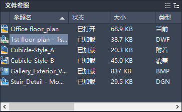 “参照名”列始终将当前图形显示为第一个条目,然后依次列出其他附着文件(按照其附着次序)。