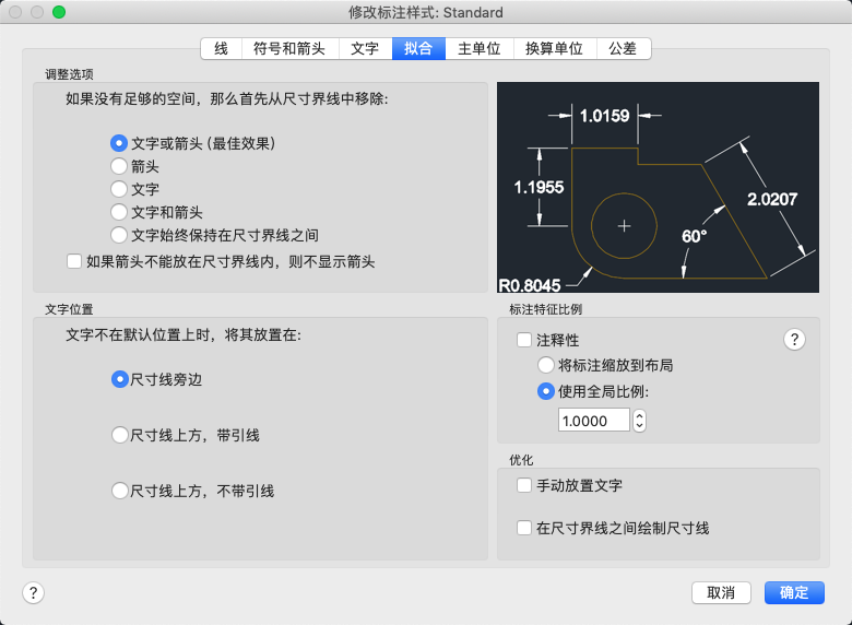 控制基于尺寸界线之间可用空间的文字和箭头的位置。