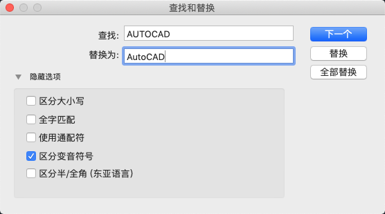 查找下一个与在“查找”中指定的文字匹配的文字,并用“替换为”中的文字替换。